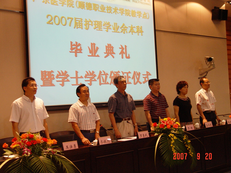9月20日,继续教育部隆重举行了广东医学院顺德职业技术学院教学点2007届护理学本科班毕业典礼暨学士学位颁证仪式,广东医学院继续教育学院院长罗辉,我院副院长罗勇武,医学系书记吴华碧、副主任陆建林,继续教育部全体人员及73名毕业生代表参加了典礼。