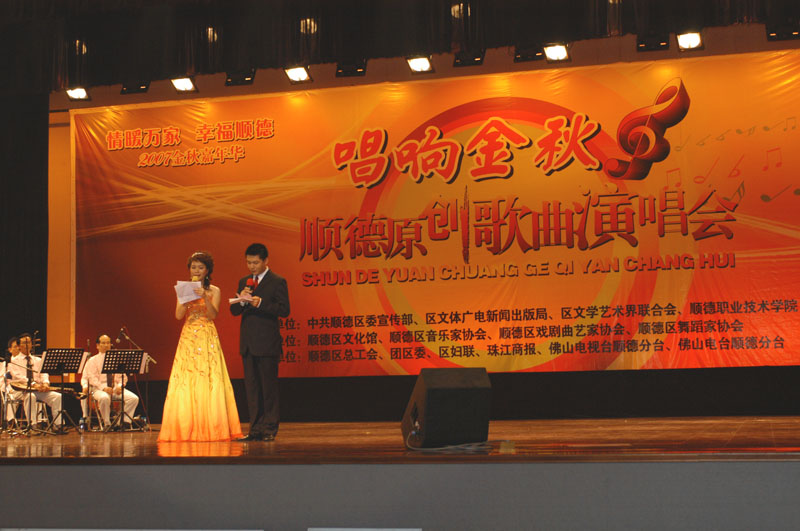 为了迎接党的十七大代表大会,为第二届顺德岭南美食节、龙舟大赛和艺术灯节的举办及为国庆节增添喜庆气氛,9月27日,由中共顺德区委宣传部、顺德区文体广电新闻出版局、顺德职业技术学院、顺德区文学艺术界联合会联合主办的“唱响金秋——顺德原创歌曲演唱会”在我院隆重举行。区委常委、宣传部部长梁惠英,副部长沈涌等领导,学院领导陈智、何锐连、邹时智、陈粟宋、谭谦章、刘毓、徐刚,以及2007级的新生出席了演唱会。