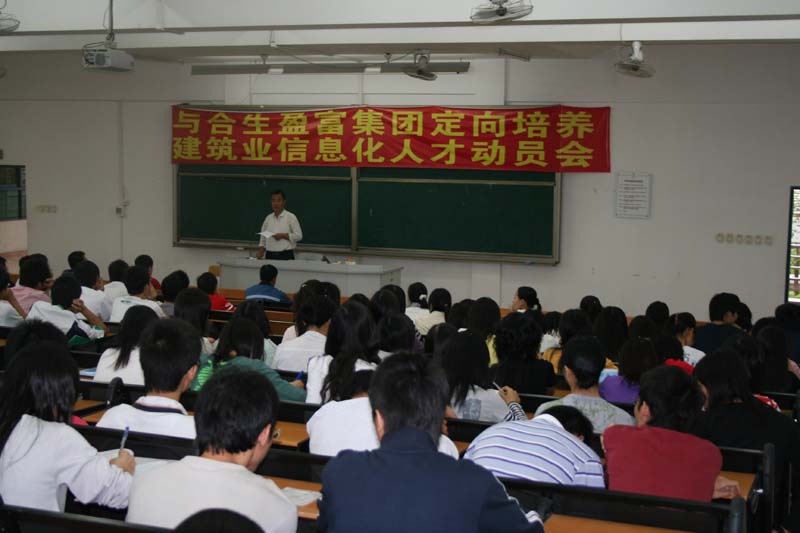 10月16日下午,计算机技术系与合生盈富集团定向培养建筑业信息化人才动员大会召开,合生盈富董事长梁智辉、巴索工程信息管理有限公司经理陆志坚和项目经理任伯景,教务处、计算机技术系相关老师以及05级全体同学参加了动员会。计算机技术系常理民副主任主持了动员会。
