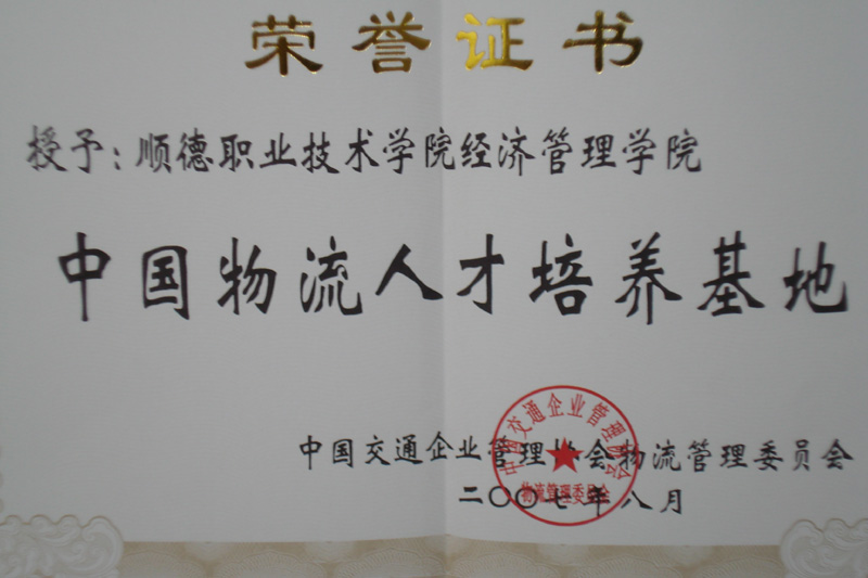 2007年8月24日至26日,中国交通企业管理协会物流管理委员会、中国物流策划研究院组织的首届“中国物流教育发展研讨会暨人才供需交流会”在北京召开,28家在物流人才教育与培养方面有突出贡献的单位被授予“中国物流人才培养基地”称号,并由中国交通企业管理协会物流管理委员会统一颁发荣誉证书及授牌。顺德职业技术学院经济管理学院在受奖单位中名列榜首。