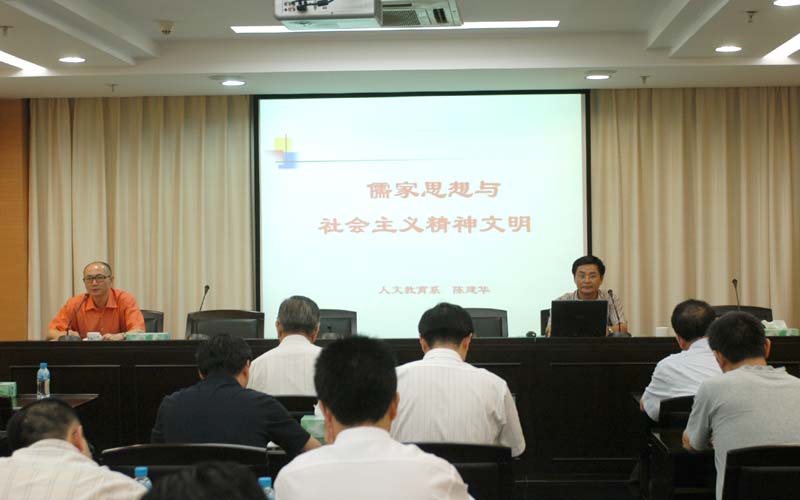 7月4日,人文教育系主任陈建华在行政楼507会议室作了题为《儒家思想与社会主义精神文明》的讲座,学院领导和全体中层干部聆听了讲座。