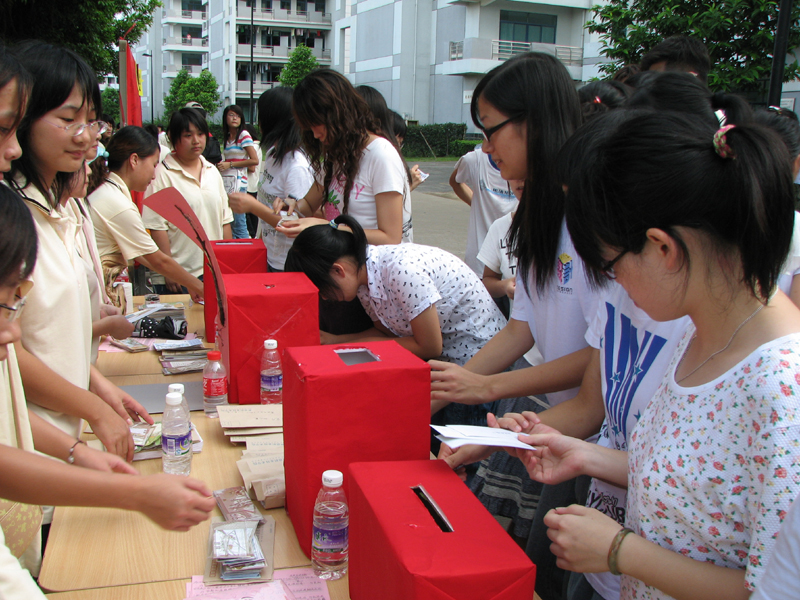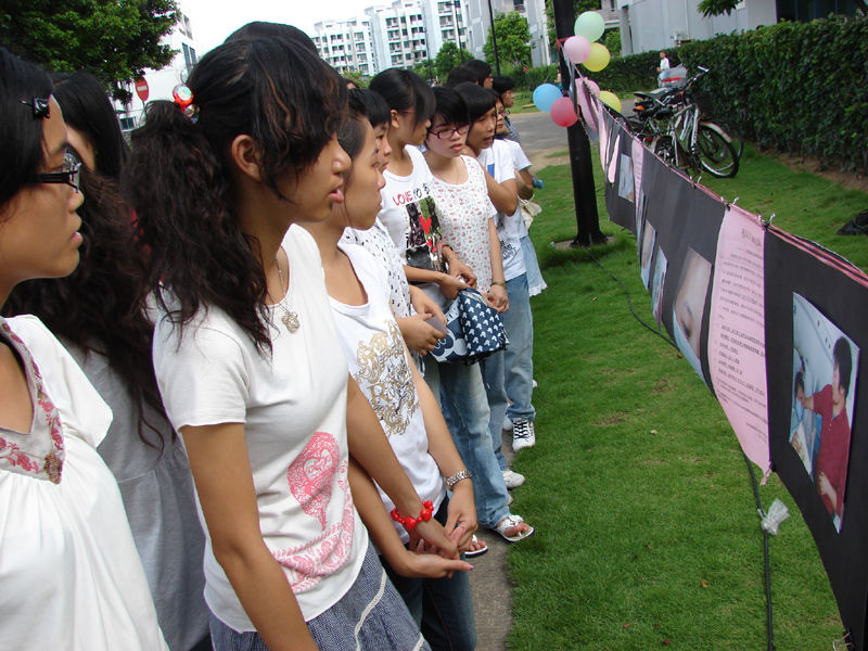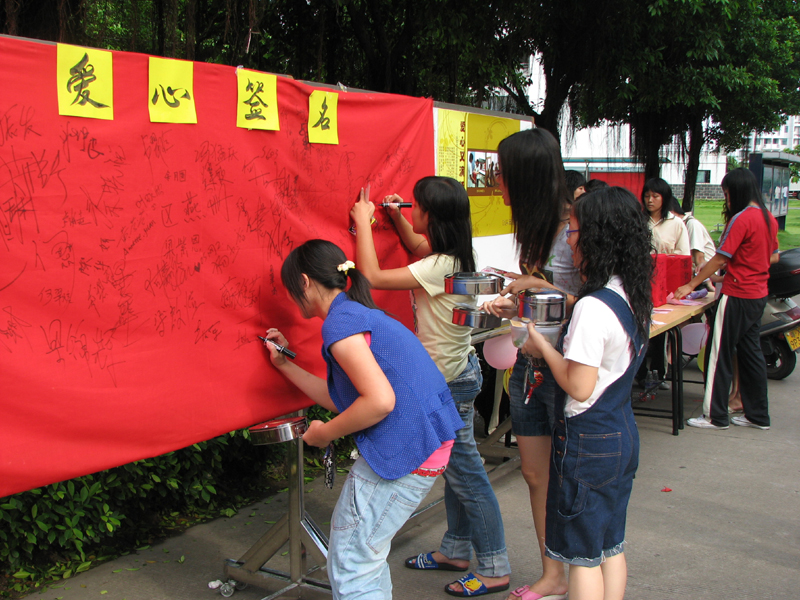 艺术设计系06装潢2班的伍凤珍同学来自中山市三角镇一个普通的农村家庭,一个开朗活泼的小女孩,拥有健康、和谐的家庭,在学校也是个品质优秀的学生。但天有不测之风云,今年6月13日,伍凤珍同学被医院诊断为 “急性颗粒增多的幼粒细胞白血病”,面对40万的昂贵医疗费,全家人陷入无助之中。面对这样的情况校团委、校学生会、艺术设计系团委、学生会以及艺术设计系06装潢2班决定筹办一次爱心签名、募捐活动,希望能够给不幸的伍凤珍同学献出自己绵薄的之力,艺术设计系06环艺班表演的手语《感恩的心》拉开了活动的序幕,捐款的师生陆续的过来,经济管理学院、机电工程系、计算机系、外语系、艺术设计系……的师生来了,5元、10元、50元、100元……大家纷纷把自己的爱心放入捐款箱,这一幕幕的动人情景将成为永恒,留在每个人的心中,爱的暖流久久地在我们每个人的内心深处流淌,随着一段段动人心弦的旋律,活动气氛渐渐进入高潮。