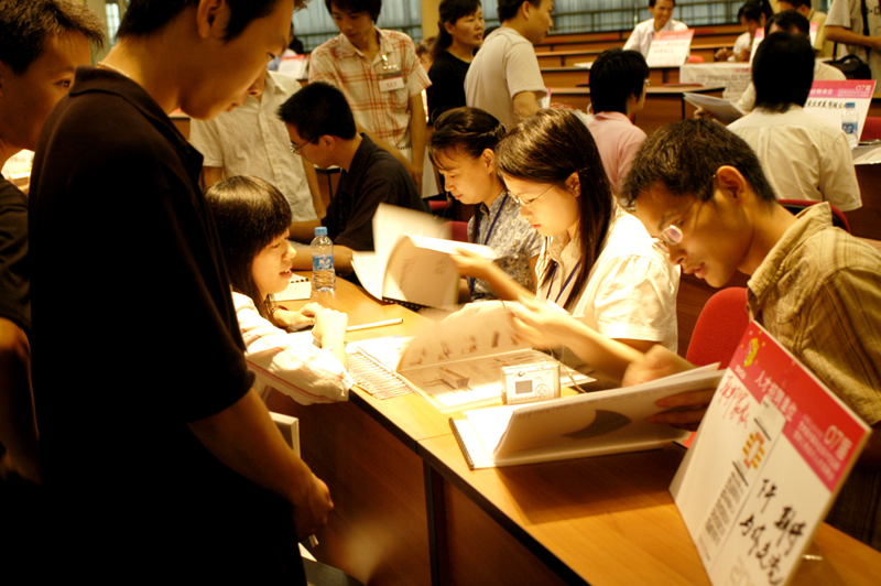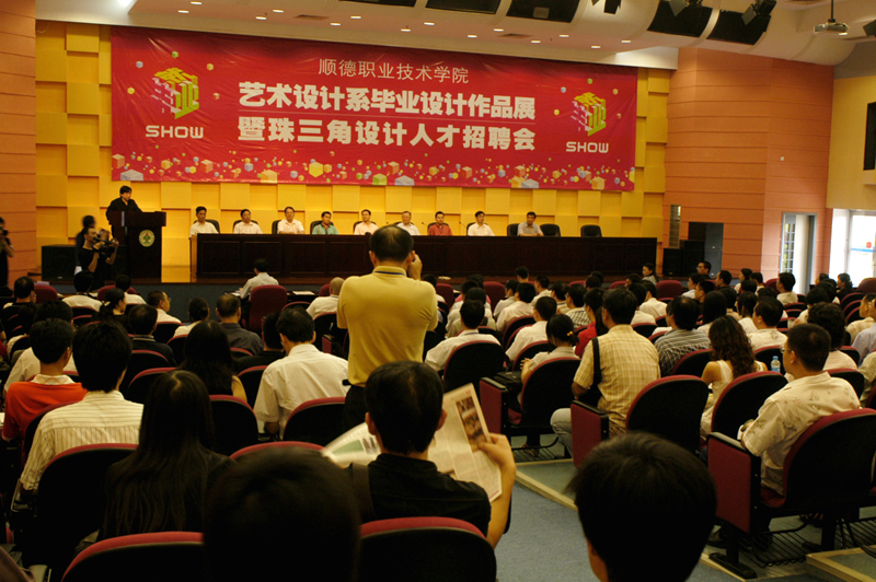 6月9日,由艺术设计系主办的“顺德职业技术学院艺术设计系2007届毕业设计作品展暨珠三角设计人才招聘会”在学院学术交流中心开幕。学院领导陈智、何锐连、邹时智、陈粟宋、谭谦章、刘毓,全国工商联家具商会副秘书长郭力兵,广东省家具协会会长王克,广东地区高校和业界的同仁以及近来自北京、浙江以及珠三角地区100家企业用人单位代表共计300多人出席了毕业设计作品展开幕式暨珠三角设计人才招聘会。