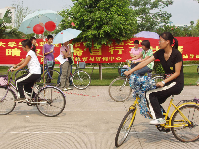 本次活动围绕“关注心理健康,放飞绿色心情”这一主题,以骑自行车比赛的形式,培养同学们良好的团队合作精神,培养健康的人格;通过各系代表队对自行车的装饰、设计等途径,广泛宣传心理健康知识。在正式比赛和互动环节的比赛中,各选手都全神贯注地投入比赛中。尽管是在夏日炎热的阳光下,同学们满面都洋溢着兴奋的表情。在这轻松活泼而又极富挑战的比赛中,同学们既体会到自我挑战和自我超越的自豪感,又享受着团队合作带来的快感。