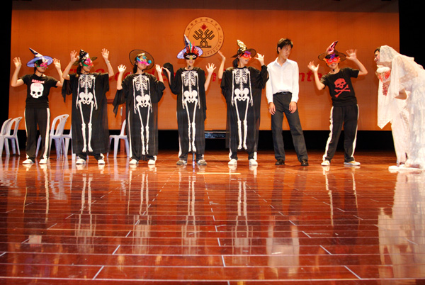 由医学系和机电系联袂演出的《Corpse Bride(僵尸新娘)》首先登场,打响头炮。森林、教堂等场景的变幻,配合着精美的ppt,渲染了一种神秘的感觉。接着的《The Spring of the Idiot(傻子的春天》仍然由医学系和机电系联手打造,吹笛小童和傻子活泼生动的表演带来一股春天的气息,惟妙惟肖。同时,国王、王后的唐装和公主婚纱体现了中西合璧的风味。