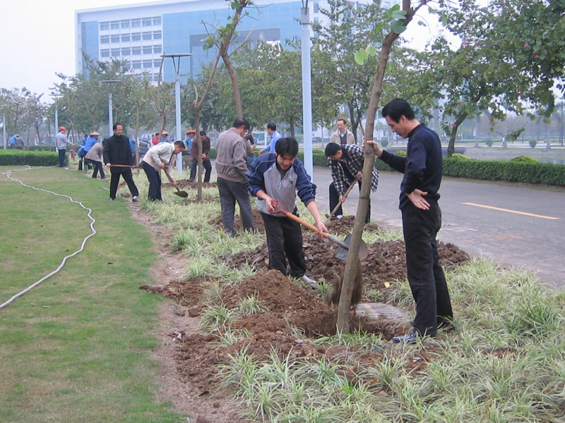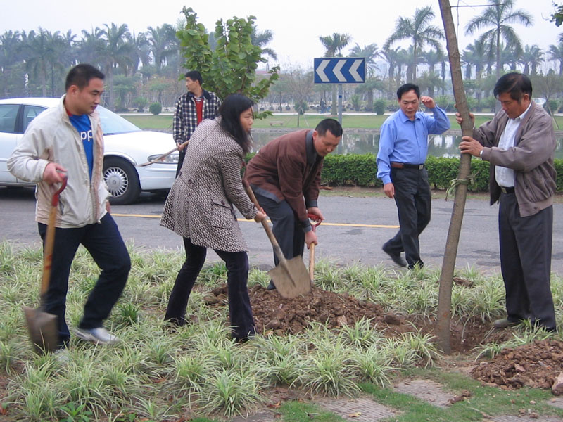 植树现场一派热火朝天的景象,有的挖树坑,有的抬树苗,你扶树,我培土,你围坑,他浇水……个个忙得不亦乐乎,绿化技术人员不停地跟踪讲解栽植要领,大家齐心协力,短短一个多小时,共种紫荆花树60余株。