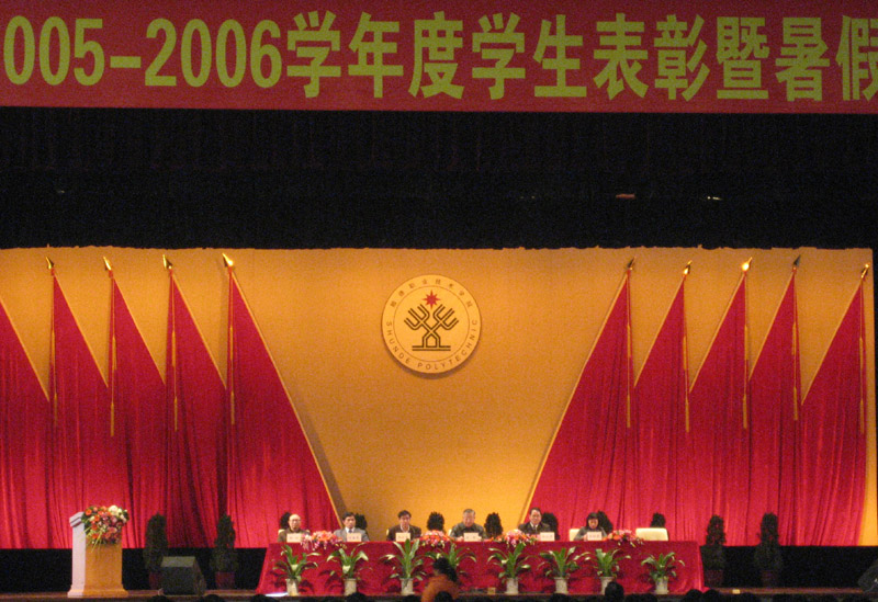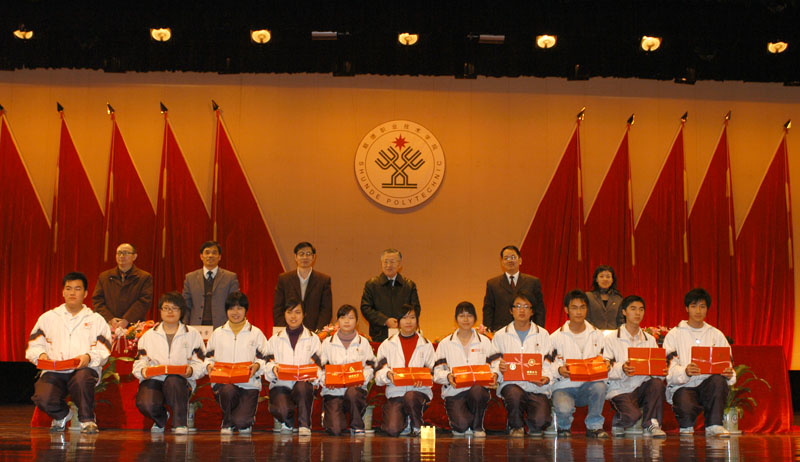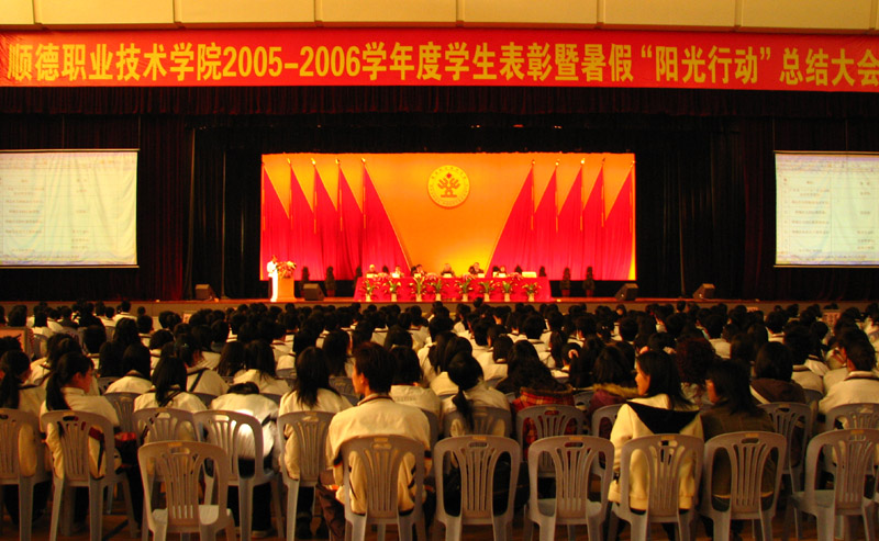 会上,何锐连副院长宣读了《关于顺德职业技术学院2005-2006学年度学生表彰的决定》,本学年共评选并奖励各类学生先进集体56个,奖学金先进个人3311人,优秀学生标兵27人,优秀学生154人,优秀团干102人,优秀学生干部132人,奖励通过国家英语六级考试3人,国家 英语四级考试27人,奖励参加省级、国家级技能、文体、创新发明比赛获奖41人。
