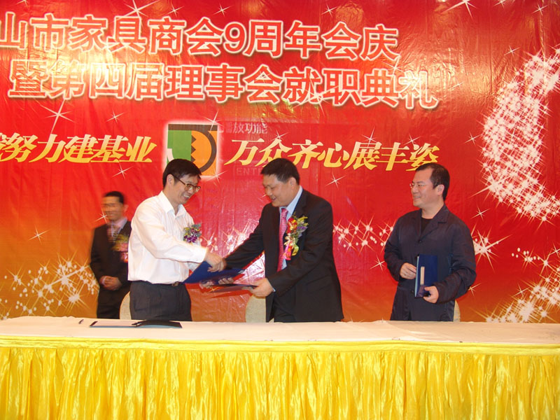 11月8日,在中山市家具商会成立9周年庆典晚会上,我院副院长邹时智与中山市家具商会会长黎伟长共同签署了“顺德职业技术学院与中山市家具商会战略合作伙伴意向书”。中国家具协会领导、中山市政府领导以及来自珠江三角洲的家具企业家,我院艺术设计系主任彭亮与廖荣盛副主任共同见证了我院家具设计专业与广东家具行业“产、学、研”合作的时刻。