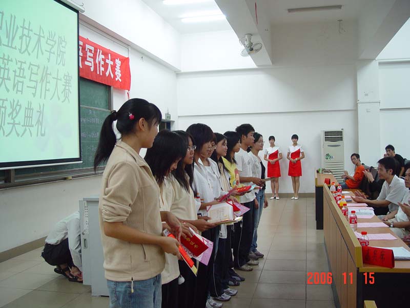11月15日晚,顺德职业技术学院首届英语写作大赛颁奖典礼在教学楼3栋300成功举办。经过初、决赛,首届英语写作大赛一等奖由05外贸(1)班的李东升同学获得。
