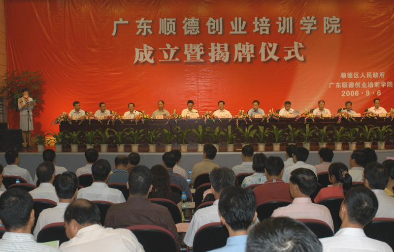 广东省第一所专门让有创业愿望和实力的人顺利创业的创业培训学院于9月6日在顺德职业技术学院成立。国家劳动和社会保障部副部长胡晓义,国家劳动和社会保障部社会保险研究所所长何平,国家劳动和社会保障部就业培训技术指导中心副主任宋建,广东省省劳动和社会保障厅厅长方潮贵、副厅长林应武,佛山市委副书记、纪委书记蔡河义,佛山市委常委、常务副市长、顺德区委书记陈云贤,顺德职业技术学院副院长何锐连、罗勇武、陈粟宋,纪委书记谭谦章及市、区、镇等领导和各行业协会、专业协会会长或副会长195人莅临成立大会。