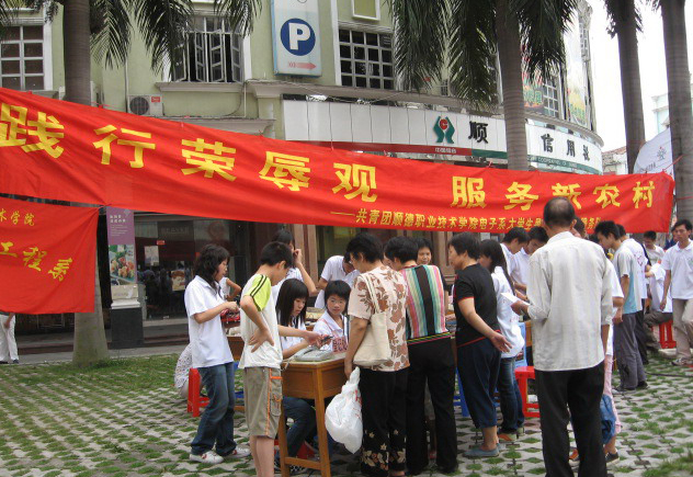 首站来到了顺德区大良街道桥珠广场,直至下午四点,义修队共收到156件,修好电器133件。群众送修的电器品种比较多,有电话机、电风扇、VCD机、DVD机、电饭煲、电视机、收音机、验钞机、电吹风等十多种,问题也各不相同,有短路、断路、元器件烧坏等。义修队的队员们都很认真地对每一件电器进行详细检查、找出问题、分析问题、进行维修、仔细复检。对于难于解决的问题,队员们在专业老师的指导下,现场讨论、分析、解决。对于一些确实很破旧没办法修复或购买不到零配件的电器,队员则给群众做好耐心细致的解释说明。在义修的同时,义修队还特意安排了一项“安全用电常识”宣传活动,部分队员向过往的群众派发“安全用电常识”传单,并为他们讲解家庭用电要注意的一些问题。虽然有些群众家里家电品种繁多,但是仍有一小部分人对安全用电知识有些模糊,经过义修队员的解说之后,他们都有了进一步的认识。