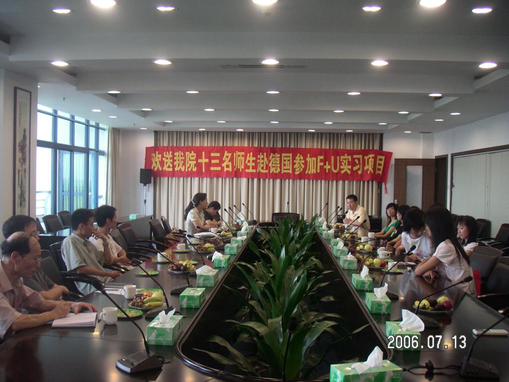 7月13日下午,学院为13名将赴德国参加2006年暑期F+U实习项目的师生而举行的欢送座谈会在行政楼508会议室举行。学生处副处长甘慕仪、经管系主任金锡万、副主任马瑞、计算机系主任陈遵德及外事办公室人员和来自我院3个系的11名赴德国F+U实习的的同学参加了欢送会。在外出差的副院长陈礼、科技处副处长刘晓顺也专门委托外事办公室转达了他们对出国师生的祝贺以及对此次活动的要求和建议。