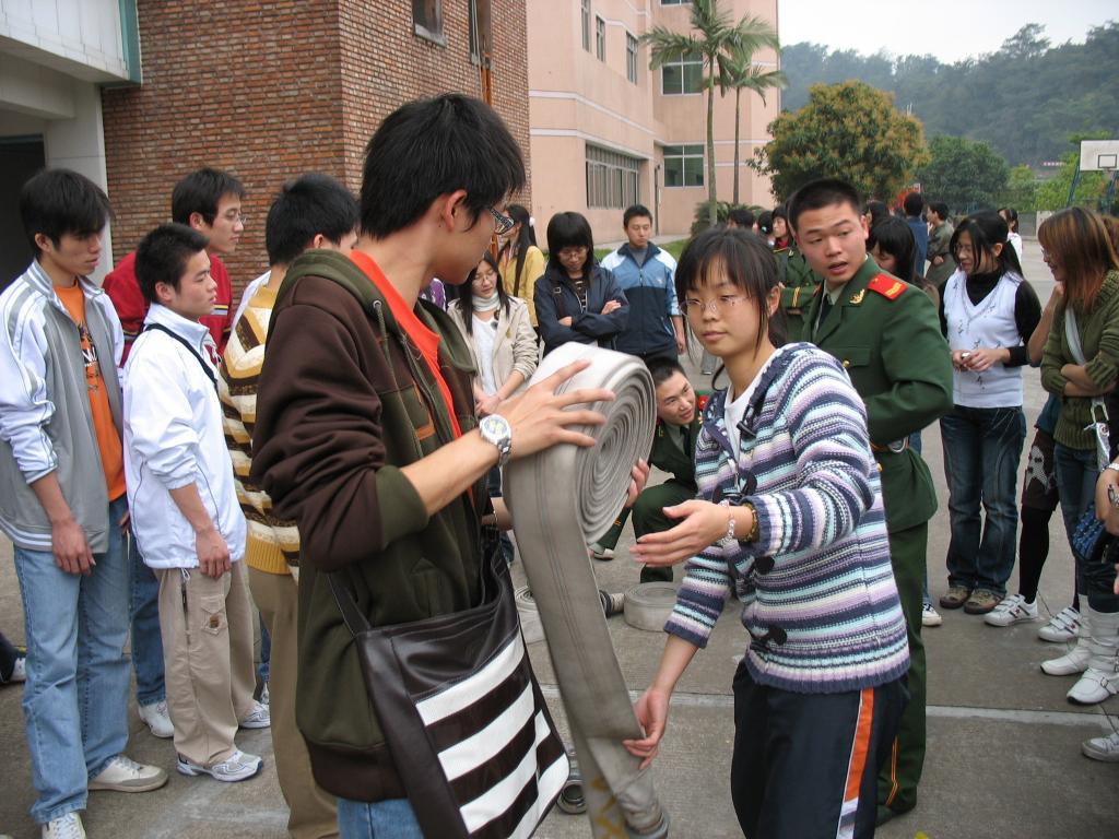 在消防基地,同学们听消防人员介绍了各种不同的消防器材装备、建筑消防设施、消防知识漫画、近年来火灾图片等内容的展示,使同学们对“水枪”、“水带”、“消防车”、“破拆工具”等消防器材装备及各种消防常识加深了认识和了解。最后同学们观看了消防官兵表演两盘水带连接、高空逃生等消防技能,还学习了消防栓、灭火器、等消防器材的使用,掌握了基本的消防技能。