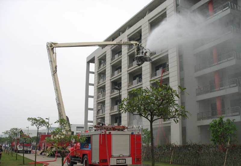 3月22日下午,我院在学生宿舍H座进行了模拟消防演练活动。演练以报警、疏散逃生、火灾扑救为主线展开。4:20分火警报警声响起后,H座的同学们在物业公司的保安、舍务员的指引下迅速从两边楼梯疏散,云梯升空把仍困在宿舍的两名同学救下来,移动水枪等多支水枪喷水灭火,整个演练只用了15分钟顺利结束。演练活动加深了学生们对火灾认识和消防技能、逃生技巧的理解。同学们都说,通过这样的消防安全教育,感受深刻,效果非常好。