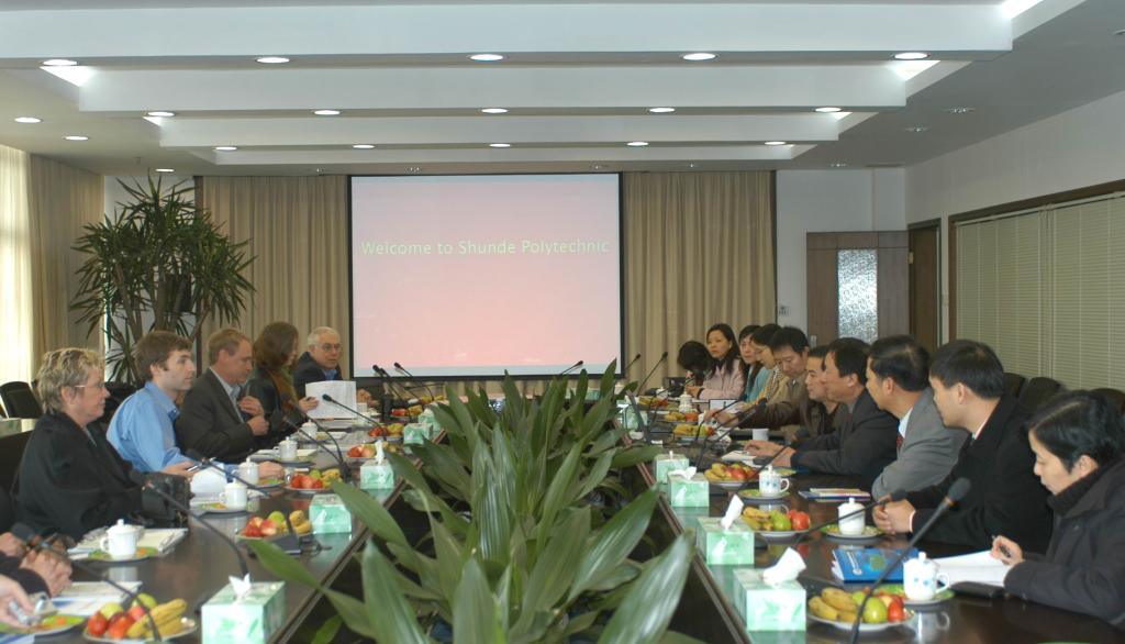 我院陈礼副院长用流利的英语向来宾介绍了我院的基本情况。他说,顺德职业技术学院是于1999年经国家教育部批准成立的由顺德政府投资、民间集资兴办的一所普通高等院校。学院占地1802亩,已投资10.02亿元,建筑面积37万余平方米。校内一水环绕,嘉树掩花,群楼错落。现有全日制在校生8000人、成人业余学历教育学员6300多人,专任教师353人,其中副高职称以上的123人、研究生学历或硕士学位以上者108人,藏书60余万册。 学院现设有机电工程、电子工程、计算机技术、医学、经济管理、人文社会科学、艺术设计、外语、教育、酒店及旅游管理、继续教育部等11个系部,开设专业30多个,学院的办学理念是“立足地方、以人为本、崇尚品位、办出特色”。目前,学院拥有全国首批高职高专教学改革试点专业2个, “国家精品课程”5门,省级精品课程7门,院级精品课程10门。几年来,学院先后获得国家高等教育教学成果二等奖2项、广东省高等教育教学成果一等奖5项、二等奖1项。学院与香港理工大学合作开办了《酒店管理》专业,与澳大利亚TAFE学院合作开办了《物流管理》和《电子商务》专业,与英国BTEC合作开办了《工商管理》(BTEC商务)专业。在2005年12月,学院参加了教育部高职高专人才培养水平评估,以全优的成绩通过了评估。学院力争在2010年前把学院建成有国际影响的、国内高水平的、具有高职特色的、大众化、开放式的现代地方大学。