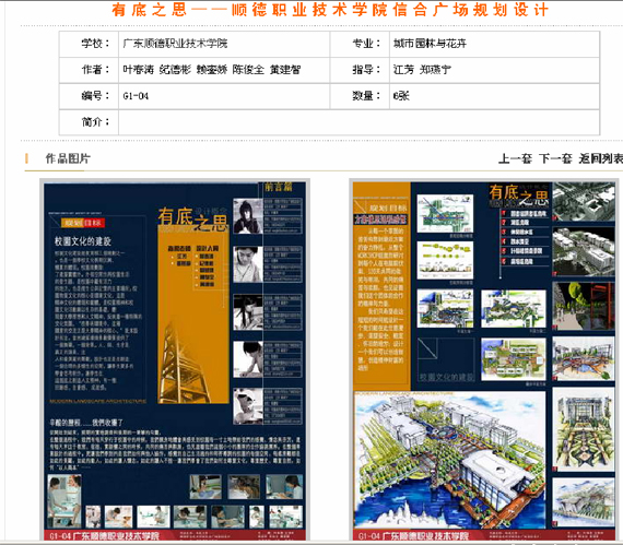 本次毕业设计作品展得到了包括沈阳建筑大学、上海交通大学、同济大学、天津大学、哈尔滨工业大学、南京林业大学、华中农业大学、中央美术学院、中国美术学院、顺德职业技术学院等全国45所农林、建筑、规划及艺术类高校的大力支持。作品设计范围涉及公园、广场、住区、道路、新校区、商业街、滨水区、度假区、风景区、建筑单体及等不同类型项目。所以希望能通过农林、建筑、规划及艺术类等院校的首次同台交流和展示,来一起推动景观设计专业的发展,从而提高景观设计行业的整体水平,构建可持续发展的和谐社会。在45所学校中,顺德职业技术学院是参赛的唯一的高职类学校,并且顺职院的作品获得了一名二等奖,三名入围奖,并且全部参加网络展的好成绩,设计作品理念新颖独到,设计思路清晰,文化韵味丰富,注重生态。其中二等奖的作品为由江芳老师和郑燕宁老师指导的叶春涛等同学的设计作品《有底之思——顺德职业技术学院校园景观规划设计》;入围奖的作品为由郑燕宁、江芳老师指导的《延续地域文化——广东省佛山顺德区顺德职业技术学院校园景观规划设计》、由郑燕宁、江芳、李冬妹、卢伟成老师指导的《安静 感受纯粹---广东省佛山顺德区顺德职业技术学院校园景观规划设计 》,这次的毕业设计大奖的成绩充分地肯定了我们园林专业在专业建设和人才培养模式以及教改景观“WORKSHOP”上的成绩。