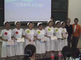 在这次无菌操作比赛(决赛)中,来自03级高级护理专业共有14名选手同台竞技,她们严格按照“准、快、轻、巧、灵”的护理操作要求,向在场的评委与观众展示了“白衣天使”一流的职业形象和娴熟的专业技能,并赢得了阵阵的掌声。经过激烈的角逐,詹小珠等两位同学荣获一等奖,刘春花等五位同学荣获二等奖,梁萍芳等七位同学荣获三等奖,同时,李惠欣等十二位同学荣获优秀奖。