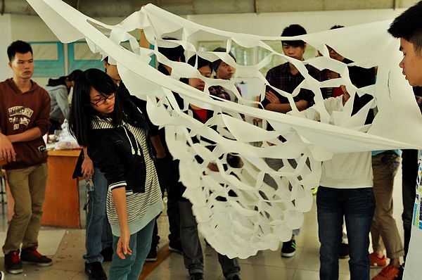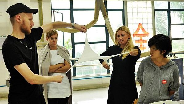 11日下午,工作坊在设计学院实训基地正式展开。芬兰设计师通过设计讲座指导学员们进行方案构思和设计,并将学员分为7个小组,每组都由不同专业背景的学生组成。随后,学员们采用手绘、计算机辅助设计等手段,使用卡纸板、纺织品、针线等材料进行了原型设计和模型制作。芬兰设计师对每个组的同学逐一进行指导,并对作品提出修改建议。12日下午,每组学员进行了方案展示和汇报。最终,第一小组的方案被采用作为参展方案,改组方案采用了中国传统的剪纸艺术技法,利用纺织品形成悬空的空间,颇具中国传统特色。随后,全体工作坊的同学对最终展览的作品进行制作。