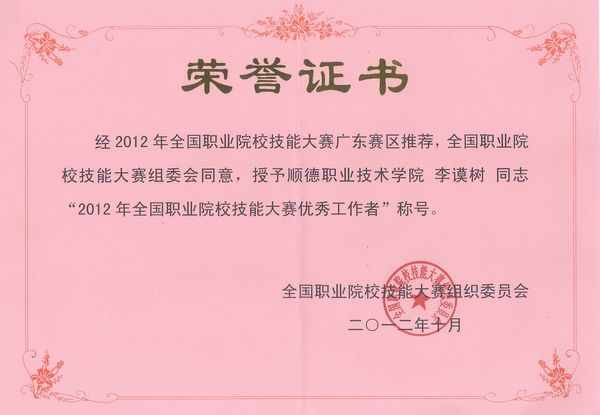 10月中旬,2012年全国职业院校技能大赛总结会暨2013年大赛工作研讨会在天津召开。会议上,教育部职成司司长葛道凯、副司长王扬南等领导从技能大赛的组织策划、运行机制建设、制度建设、校企合作推进、特色与成效等方面对2012年全国职业院校技能大赛进行了全面总结。德赢的“机器人技术应用”赛项承办工作获高度评价,竞赛的整体组织、赛场设置、接待服务、观摩区设计、宣传与推广等工作受到了教育部及省厅领导、赛事专家、参赛院校的一致好评,德赢拍摄的竞赛集锦图片和视频被选送到总结大会上进行播放宣传。德赢李谟树老师被教育部大赛组委会评选为“2012年全国职业院校技能大赛优秀工作者”,广东省教育厅副厅长叶小山为李谟树老师颁发了荣誉证书。在金秋时节的天津,德赢的大赛承办工作再次赢得广泛赞誉。
