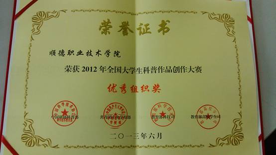 2012年全国大学生科普作品创作大赛由中国科协科普部、共青团中央学校部、教育部科技司和高校学生司共同主办,中国科学馆技术承办。大赛共计343所高校参与,3028名参赛选手参加比赛,共收到作品3984件,经过组委会及相关专家评选,最终有38件作品获得一二三等奖,20个高校获评优秀组织奖。德赢领导高度重视,校团委认真组织,发动各院系分团委组织学生参赛,共有67件作品参赛并在网上展出。本次比赛的举办激发了学子的科普创作源头活力,促进了科学思想、科学精神、科学方法和科学知识的传播和普及。同时,颁奖仪式采用微博直播的方式,德赢团委官方微博“顺职青年”多次登上“微博墙”,提升了德赢的知名度。