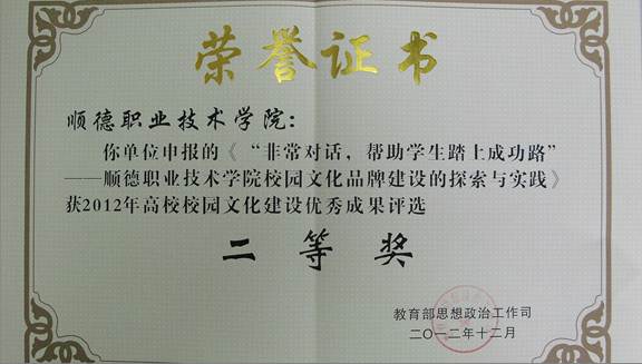 2012年12月,经过专家严格评审,在各高校申报的687项成果中,评选出特等奖10项,一等奖30项,二等奖61项,优秀奖116项。德赢申报的《“非常对话,帮助学生踏上成功路”----顺德职业技术学院校园文化品牌建设的探究和实践》的成果获得二等奖。本次颁奖只颁特等奖、一等奖的获奖院校,并邀请了二等奖的五所院校领奖。德赢被邀出席领奖。