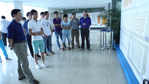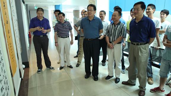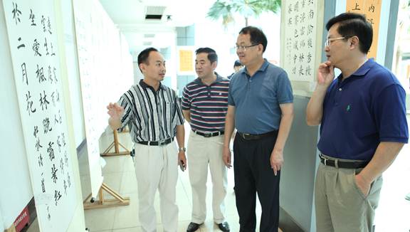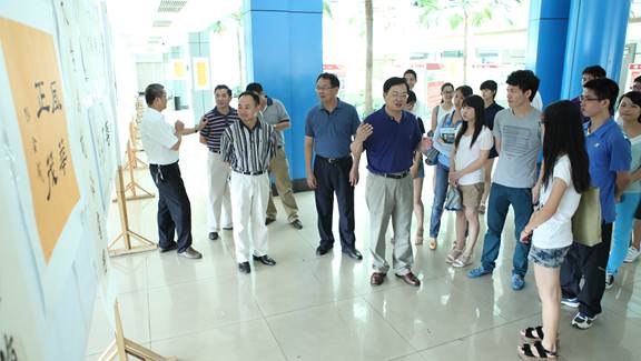 7月4日上午,夏伟校长、何锐连副书记一行参观了由学校党委宣传部、人文教育系主办,教务处、设计学院和图书馆承办的“点线横斜 墨韵浮动”——2013人文素质教育特长生班书法习作展,并与特长生班学生和指导教师交流书法心得。夏伟校长对展览的成功举办表示了祝贺,认为此次展出的作品比去年的整体水平要高。希望师生们继续努力,除了自身练好书法外,还应把练习书法的益处传播到其他同学中去,为推动校园文化建设作出应有的贡献。