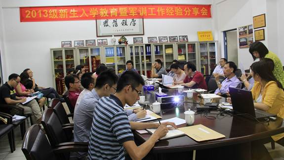 当天,大家齐聚在外语学院会议室,围绕如何做好新生入学教育暨军训工作展开深入的研讨。首先,学生处负责人总结了新生报到、入学教育、体检、军训、迎新晚会等方面情况,重点介绍了全校性的工作在各院系与职能部门间的通力合作下,通过精心策划、精细管理、协调沟通、注重细节等方面的努力,使到迎新期间各项全校性工作衔接顺畅,紧张、有序、高效、圆满地完成。分享会上,化工学院介绍其提前了新生入学教育的起点,例如在假期招生期间,发挥新生班主任的专业引导,增强学生对学校与专业的认识,并把新生家长作为入学教育群体,从多方面做好学生的思想工作,保障学生的报到率;酒管学院从新生报到开始成立工作组,在组织、后勤、宣传等多方面全面开展工作,抓好学生助理的选拔与培训,发挥学生干部的能动作用,确保新生军训工作的顺利开展;外语学院从“给新生一封信”、“家长信息反馈表”、班主任及学生干部工作队伍培训等多方面做好迎新准备,并利用语言、文化、活动、管理等四个载体将“一个仪式”(开学典礼暨宣誓仪式)、“四个教育课程”(人生课、适应教育课、学长交流课、外出参观课)等教育管理活动贯穿到整个新生入学教育及军训工作中,让新生尽快适应大学生活。