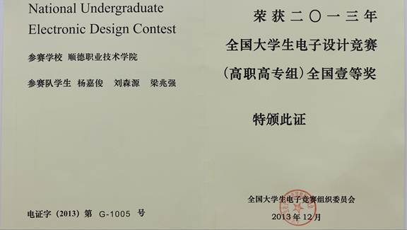2013年12月7日,由教育部和工信部主办的“瑞萨杯2013全国大学生电子设计竞赛”颁奖典礼在北京航空航天大学隆重举行。德赢电子与信息工程学院在本届大赛中取得了历史性突破,由昂勤树、谢飞老师指导的参赛作品“L题:直流稳压电源及漏电保护装置”以广东赛区高职高专组该题测评成绩第一的出线,并获得国赛一等奖;由蔡永昶、吴锦麟老师指导的J题获国赛二等奖。广东省共有来自顺德职业技术学院、深圳职业技术学院和中山火炬职业技术学院三支队伍获高职高专组国赛一等奖,并赴京参加颁奖大会。
