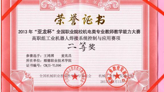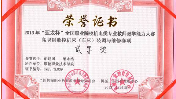 12月13日至15日,全国机械职业教育教学指导委员会、机械工业教育发展中心主办的全国职业院校“机电类专业教师教学能力”大赛在江苏、浙江等地隆重举行。德赢机电工程学院选派王鸿博、麦兆昌、胡建国、黎永浩四位老师组成两只代表队,参加“工业机器人系统控制与应用”、“数控机床(车床)装调与维修”两个赛项的角逐,均荣获“二等奖”,同时荣获“全国机械职业院校实践教学能手”称号。