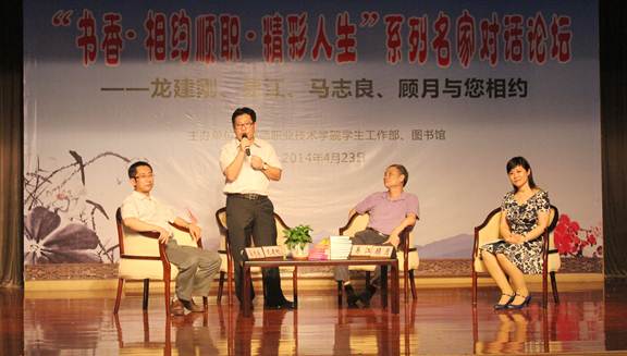 名家对话论坛活动从欣赏三位嘉宾的佳作开始,主持人在抒情的音乐中朗诵了易江的《人生华章,写好生命的每个篇章》、龙建刚的《给儿子的一封信》、马志良的《书房在南书在北》,优美的朗诵、舒缓的音乐、柔和的灯光将顺职学子引入到浓浓书香的阅读氛围。紧接着,三位嘉宾与300多名学子分享了阅读体会,龙建刚先生讲述了自己靠读书走出了大山,通过读书改变命运的经历。他勉励现场学子当面对不理想的境遇时,要改变自己,不要去埋怨,“全世界抛弃你时,只有伟大思想家、作家陪伴你,他们召之即来”。马志良认为阅读可以改变一个人的心境,是个性化的体验,要阅读自己喜欢的书籍。易江教授则告诉大家怎么读书,多读使自己身心健康、能让人安身立命的书。顾月认为阅读需经历从读书、读世到读人境界的转换,把书读活,通过阅读学会做人,做最好的自己。