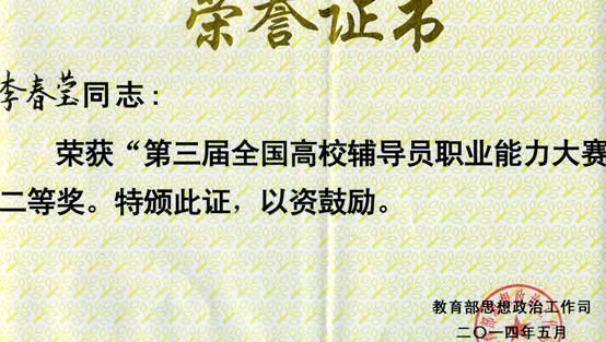 5月6日—9日,由教育部思想政治工作司主办,全国高校辅导员工作研究会承办的“全国第三届高校辅导员职业能力大赛决赛”在山东大学举行。德赢外语学院李春莹老师继获得省赛一等奖、华南赛区一等奖后,奋勇拼搏、愈战愈勇,最终在全国众多优秀选手中脱颖而出获得全国二等奖,这是广东省参赛选手在历年比赛中取得的最好成绩。更为可贵的是,德赢也是全国总分前十名的获奖学校中唯一一所高职院校。
