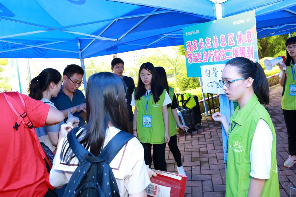 一到迎新现场,梁銶琚堂外“热烈欢迎2017级新同学”的巨型横幅便映入眼帘,旁边还悬挂着一对高大的竖幅“求真知惜光阴 铸就崭新未来”,“立大志 展鸿图 实现人生价值”。17级的迎新工作,在老师与同学们的共同努力下,井然有序地进行着。迎新期间,学校领导夏伟、刘毓、陈粟宋、徐刚、谭谦章先后前往现场看望迎新师生。校领导们分别到宿舍分配区、现场缴费处、绿色通道咨询点、教务处咨询点、各学院的新生报到处以及迎新办公室,了解新生报到情况,慰问新生和新生家长,特意叮嘱老师、同学们、家长们一定要注意休息,切勿中暑!