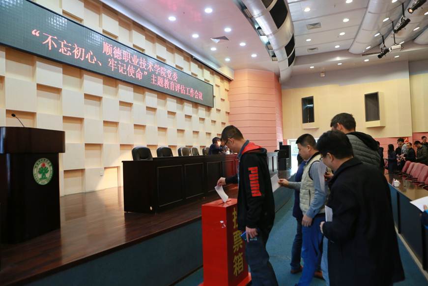 主题教育评估工作会议于学术交流中心一号报告厅举行,会议由学校党委副书记、副校长刘毓主持。全校266名教职工代表参与了本次评估工作会议。何真组长首先对本次测评工作提出了要求,随后,全体参加评议人员填写《“不忘初心、牢记使命”主题教育测评表》,并投入投票箱。