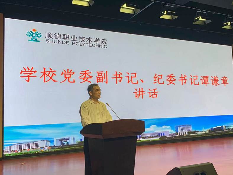 谭谦章致辞。他首先感谢佛山市顺德区民营企业发展商会对学校教育事业的支持。他表示,奖学金的设立激励了学子们感恩励志,奋发有为的志向。当前,学校成为“双高”建设单位,迎来了重大发展机遇,我们要以此为契机,以顺发商会奖学金为激励,希望同学们只争朝夕,不负韶华,感恩企业家和社会各界的关爱帮助,铭记“厚乎德行、辩乎言谈、博乎道术”的校训,为成就梦想而砥砺前行。