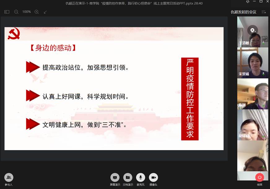 本次线上主题党日活动议程有三:一是重温入党誓词,时刻提醒党员同志们做到不忘践行初心、勇于当担使命;二是进一步了解新冠状病毒及目前的疫情防控形势,继续做好个人防护,服从学校、政府部门做好健康登记、行踪汇报等一系列信息填报工作,同时还学习了在最关键的疫情防控阶段逆向而行、无私奉献的钟南山院士、李兰娟院士先进事迹材料,还在线了解分享本教研室卢丽琴老师以及其家人赴湖北支持疫情防控的先进事迹。支部党员同志们感同身受,一致做了“我是党员我带头”的郑重承诺!三是回顾疫情防控期间以来,党员们都有做出了表率,均积极捐款,以实际行动关注、支持湖北武汉疫情。同时也做到了立足本职,率先做好停课不停学一系列工作,开学前全体党员就与学生们沟通,并积极搭建或寻找与课程相关的优质教学资源,财经党支部最早做好了网课授课计划,全部课程如期开展网络教学,并收到了良好的授课效果!