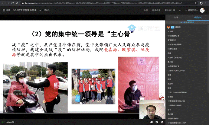 为深入贯彻落实《关于高校基层党组织在疫情防控期间开展组织生活的通知》和《关于疫情防控期间开展组织生活的通知》等相关文件要求,调动全体党员的积极性、主动性,切实提高党组织的凝聚力、战斗力,全面助力疫情防控阻击战,保证疫情防控期间组织生活常态化,根据主题党日活动方案和“三会一课”计划,3月20日下午,酒店与旅游管理学院党总支利用腾讯课堂组织开展了以“从抗击新冠肺炎看中国的制度优势”为题的“云学习会”——主题党日活动暨书记专题党课,学习会由学院党总支负责人主持,全体教师党员和学生党员参与了学习会。
