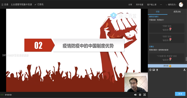 3月20日下午,我院党总支利用腾讯课堂组织全体师生党员开展了以“从抗击新冠肺炎看中国的制度优势”为题的“云学习会”,学习会由学院党总支綦恩周书记主持,全体教师党员和学生党员参与了学习会。綦书记从防疫工作讲解了我国的制度优势,引导党员坚定四个自信,并就上一阶段的学院疫情防控和党建工作进行了总结,为贯彻落实疫情防控期间开展组织生活工作、基层党组织换届选举等两项重点工作进行了详细安排。