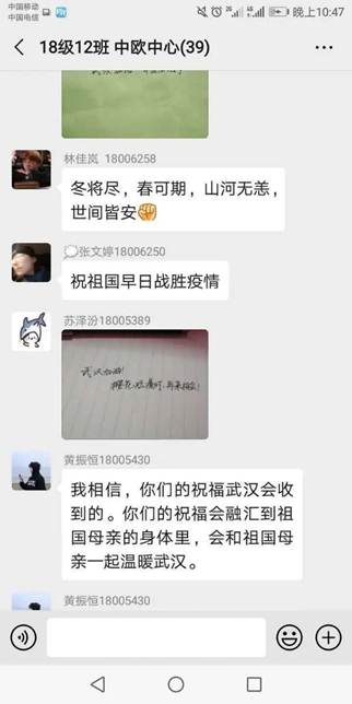 我院各班团支部积极响应校团委号召,通过线上召开了主题为“齐心战役,共克时艰”的团日活动,各班同学通过微信群传递青春正能量,用文字、漫画为武汉和湖北打call;19旅游1班团支书黎亮同学说:“共青团作为党领导的先进青年的群众组织,作为党的助手和后备军的担当,必须带头贯彻党的要求,展现出青年的作为,为坚决打赢疫情防控攻坚阻击战贡献自己的力量。