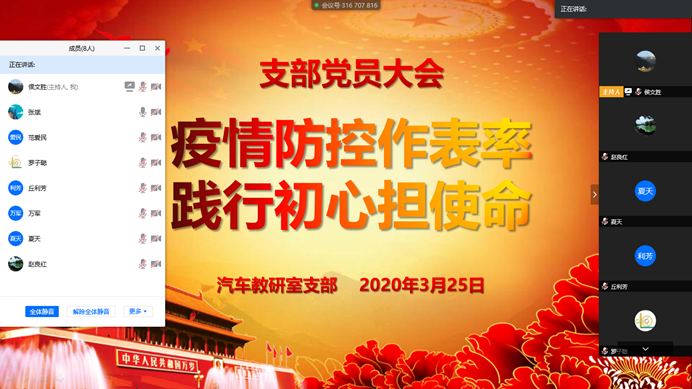 按照顺德职业技术学院党委主题党日活动统一要求,3月25日下午,能源与汽车工程学院汽车教研室党支部以“践行初心担使命,疫情防控奋争先”为主题,通过网络会议交流的模式召开了党支部会议。