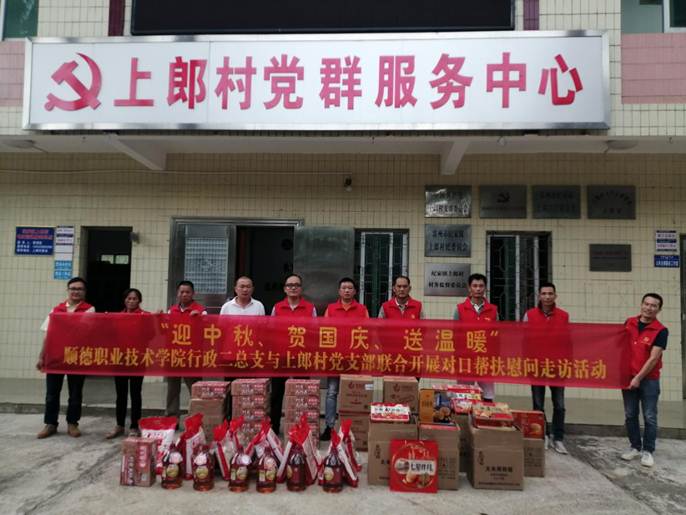 为全面贯彻落实党的十九大精神和省委省政府脱贫攻坚的决策部署,大力弘扬扶贫济困、爱心奉献的社会风尚,切实做好结对帮扶工作,让贫困家庭、困难老党员感受到党的关怀和温暖,帮助他们度过一个欢乐、祥和的中秋佳节。9月27—28日,顺德职业技术学院行政二党总支与上郎村党支部联合开展“迎中秋、贺国庆、送温暖”慰问活动,对7户特别困难贫困户、13位五保户、15名体弱病残老党员以及32户低保贫困户进行对口帮扶慰问走访,送上慰问品及美好的祝福。