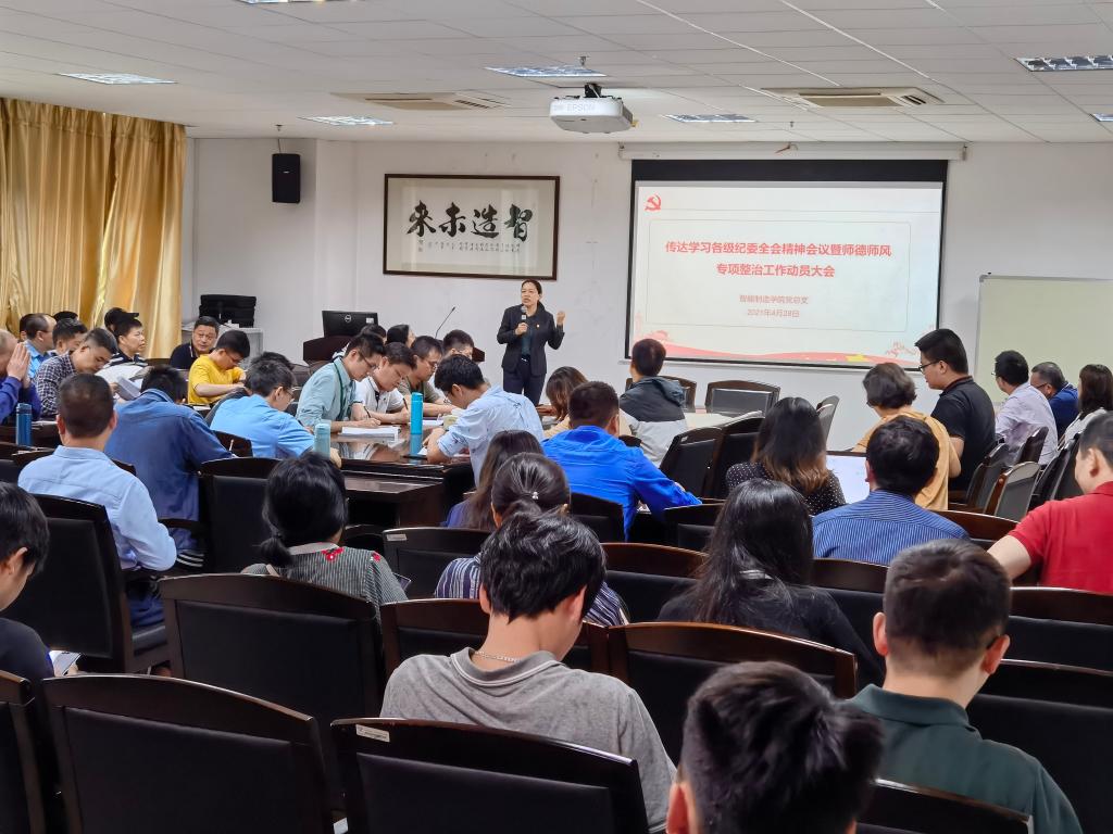 4月28日下午,按照学校的工作部署要求,智能制造学院召开传达学习各级纪委全会精神会议暨师德师风专项整治工作动员大会。学院党政班子成员,学院全体教师参加了会议。会议由智能制造学院党总支书记宋玉宏主持。