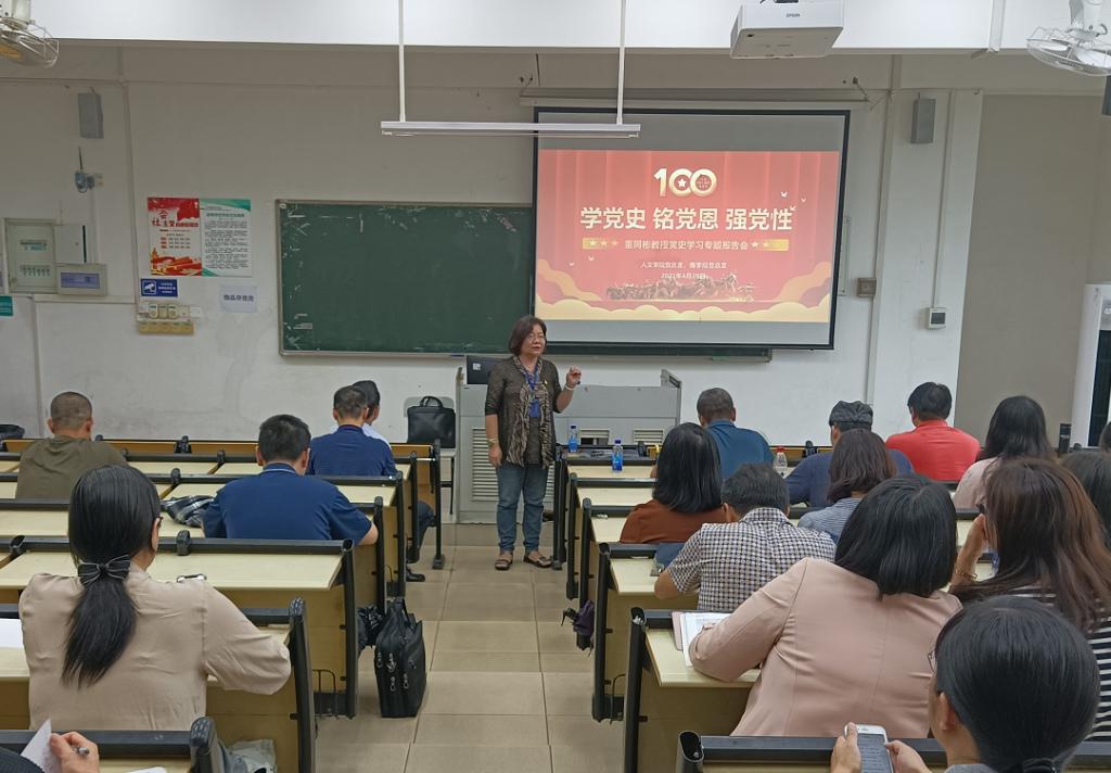 报告紧跟实践发展步伐,聚焦理论热点难点,主题鲜明、结构清晰、史料翔实。讲者理论功底深厚,所引党史故事引人入胜,娓娓道来,听者深受启迪教育,纷纷回以掌声笑语。报告有助于全体教师全面领会习近平新时代中国特色社会主义思想的重大意义、科学体系、丰富内涵和实践要求。报告结束后,商学院党总支召开党员大会,就本学期党史学习教育工作计划进行部署安排。