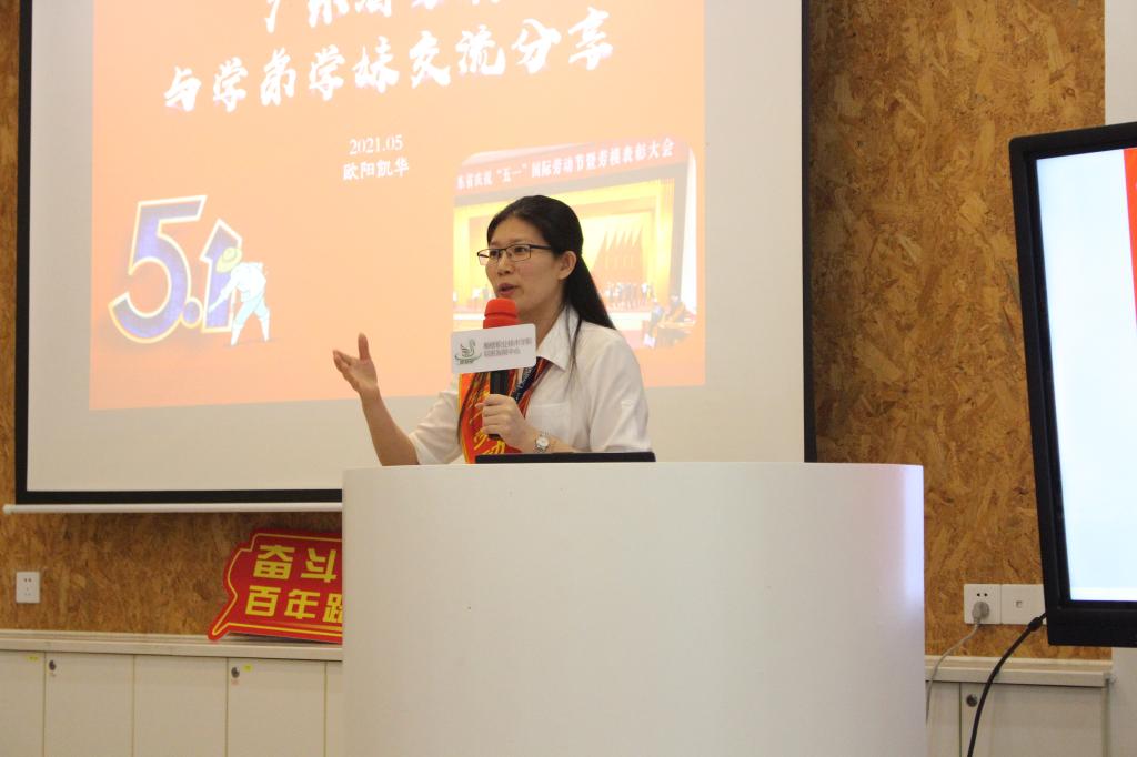 首先,由顺德职业技术学院2003届校友、广东省劳模获得者、广东高美空调设备有限公司质管部部长欧阳凯华校友用朴实的语言讲述了自己从学校到企业工作十八年来的成长经历。她认为自己只是一名普通的“挖钻人”,“勤奋、好奇、勇敢、奉献、精益求精”的优秀品质成就了今天获得的荣誉(如挖到钻石),深入诠释了“爱岗敬业、争创一流、艰苦奋斗、勇于创新、甘于奉献”的劳模精神。