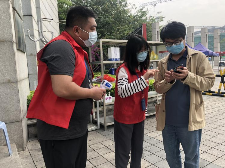 “请您出示通行证、粤康码、行程卡。”“请您配合测一下体温。”“请佩戴好口罩。”……早晨7点至9点是教职工车辆进校的高峰时段,党员们身着志愿者服装,对所有入校人员严格进行身份核验、体温检测、粤康码和行程卡查看,为校园疫情防控工作贡献力量,以实际行动为党旗增辉、为党徽添彩。