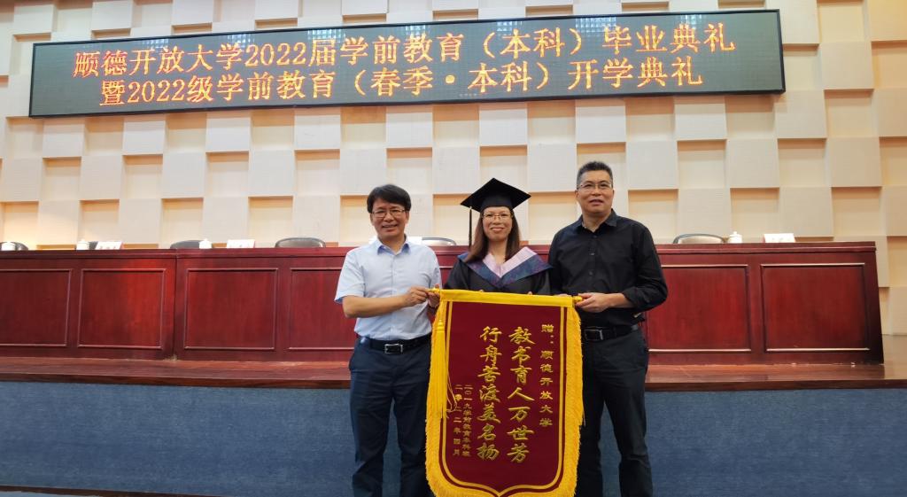 典礼在庄严的国歌声中拉开帷幕。毕业生代表老凤仪同学发言,感谢顺德区教育局给予的学费资助及政策让自己完成了本科学历提升,感谢顺德开放大学老师们的辛勤付出,自己将不辜负母校的培养和政府的期望,怀揣梦想,脚踏实地,砥砺前行,期望为顺德学前教育事业发展再立新功。2022级新生代表黄梅芳同学对顺德区教育局给予再次圆梦大学的机会表示感谢,表示将在顺德开放大学老师的指导下努力巩固专业知识,钻研理论内涵,丰富实践经验,实现新的梦想和追求。