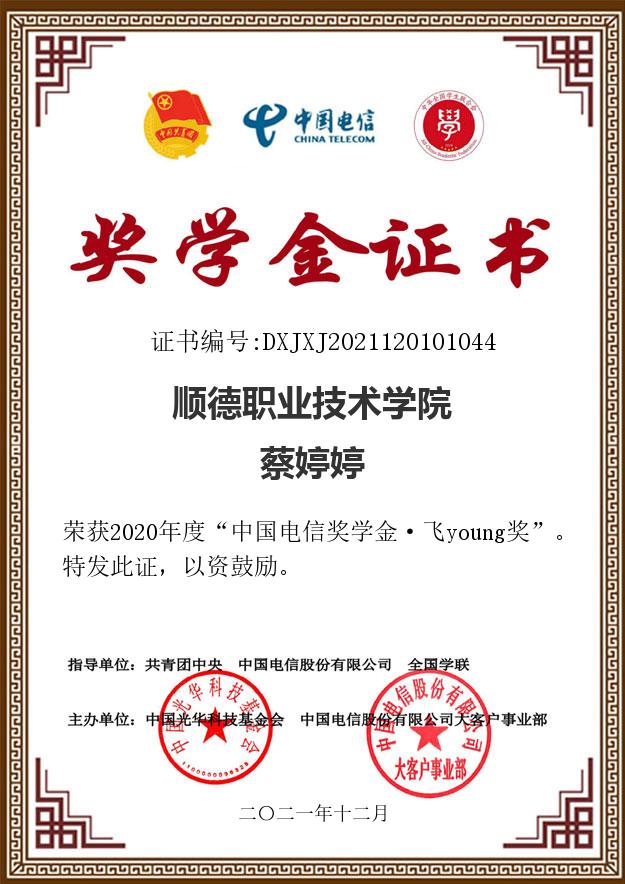2020年度“中国电信奖学金”评选结果近日揭晓,德赢毕业学生蔡婷婷获“中国电信奖学金·飞Young奖”。