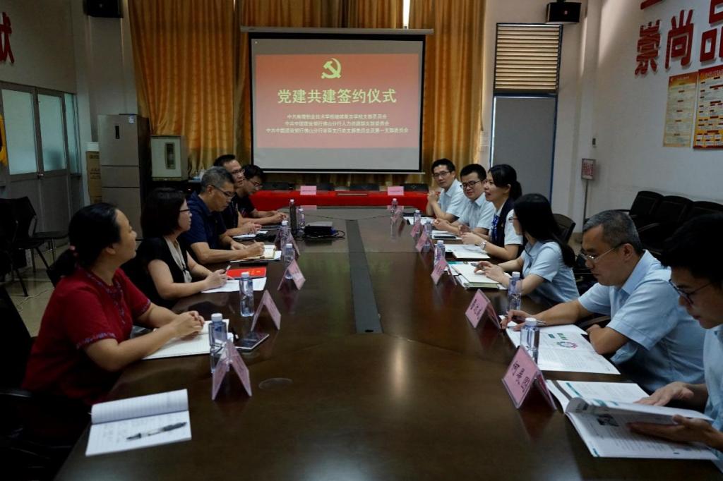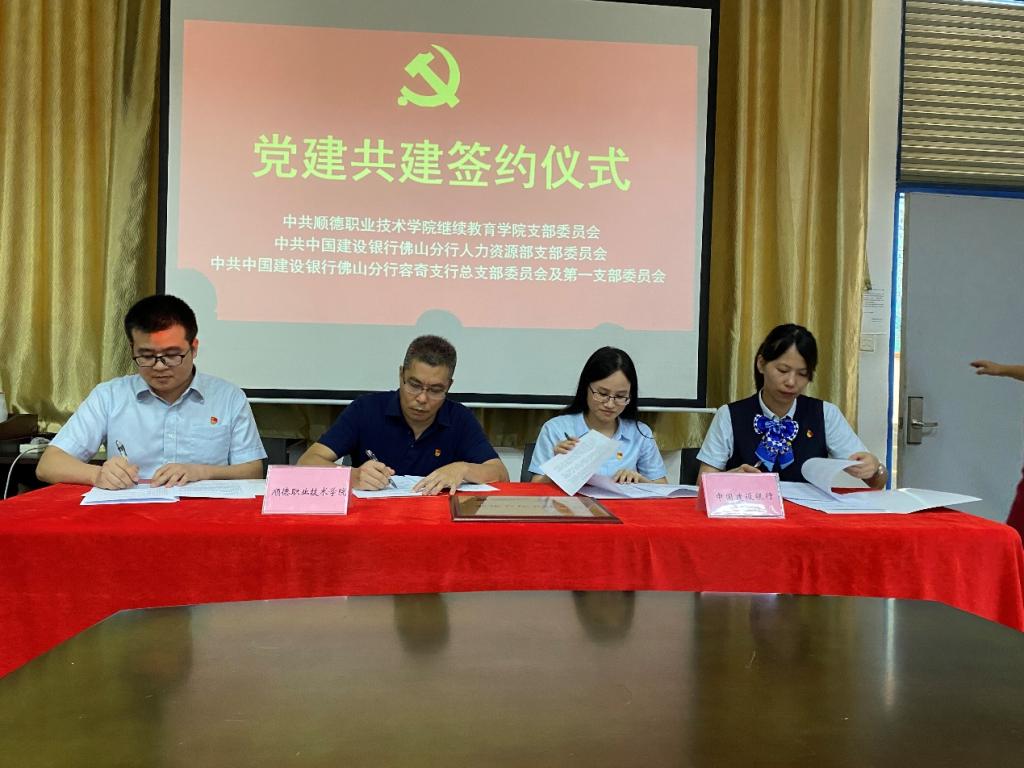 为创新党支部工作机制,激发党支部工作活力,实现银校“联学联建联动、共融共建共享”,提升社区服务和基层治理水平,7月28日下午,中共顺德职业技术学院继续教育学院党支部与中共中国建设银行佛山分行人力资源部党支部、容奇支行党总支、容奇支行第一党支部开展“党建引领、千院共建”和“劳动者港湾共建”签约仪式,同时开展党史联学共建活动和劳动者港湾宣传活动。