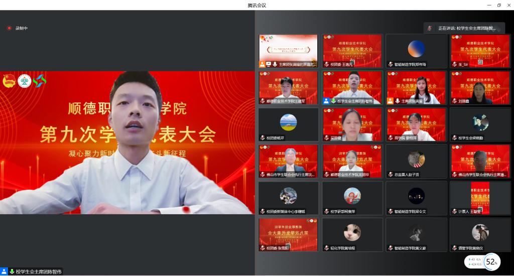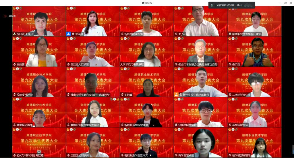 顺德职业技术学院第九次学生代表大会于11月30日晚通过线上会议方式召开。佛山市学生联合会执行主席潘国堃、沈应邦,校团委全体老师,各二级学院党总支副书记、团委书记、学生会指导老师,各团学组织代表以及139名学生代表参加会议。