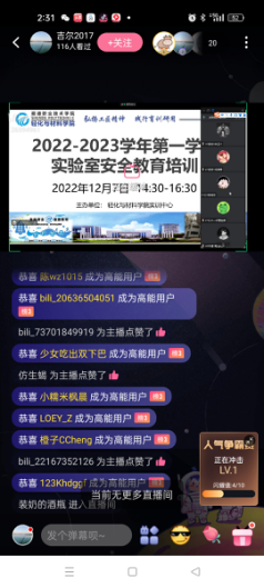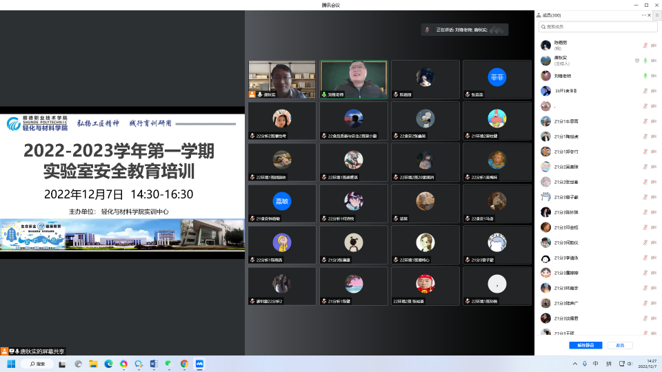 12月7日下午,轻化与材料学院以线上形式为2021级、2022级学生及学院教师开展2022-2023学年第一学期实验室安全教育培训。专题培训由副院长刘锋和实训中心主任唐秋实主讲,参会人员700多人。
