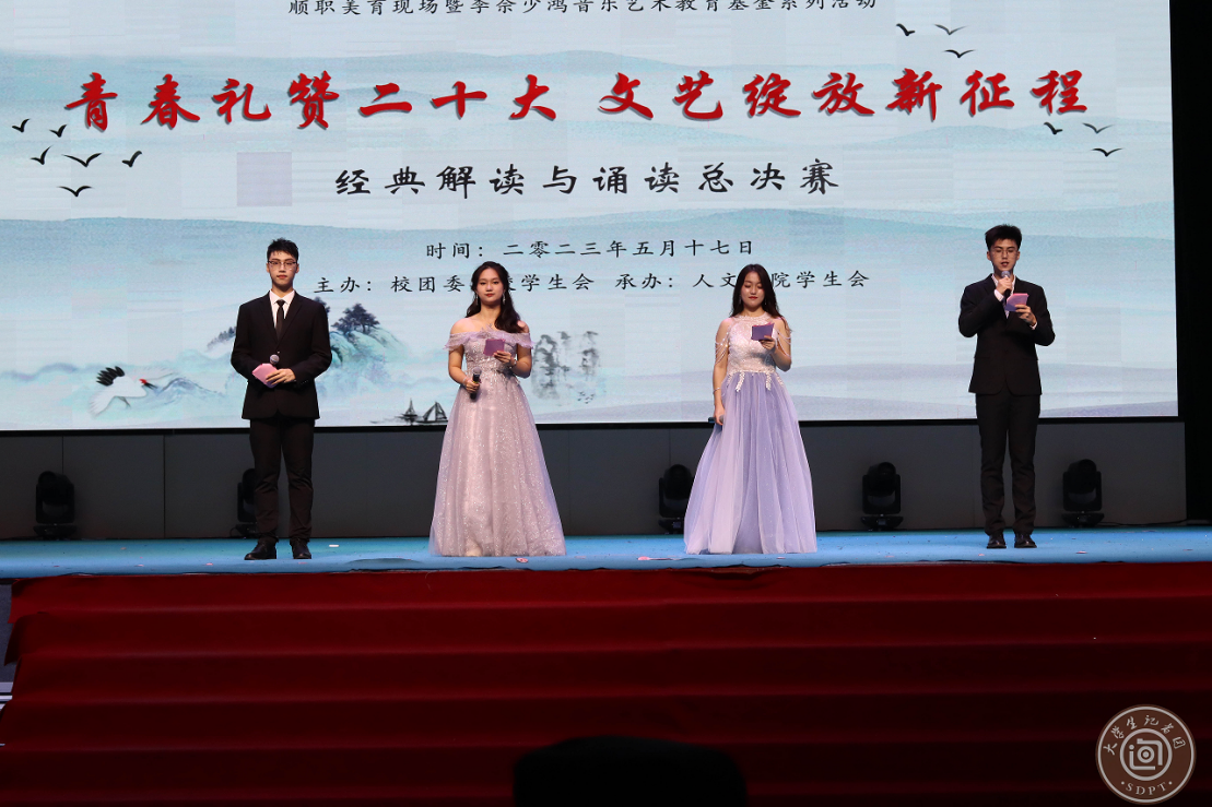 5月17日晚,由学校团委、学生会主办,人文学院学生会承办的德赢第22届大学生文化艺术节、顺职美育现场暨李佘少鸿音乐艺术教育系列活动之“青春礼赞二十大文艺绽放新征程”经典解读与诵读决赛在梁銶琚礼堂举行。活动旨在弘扬中华优秀传统文化,进一步发挥校园文化育人作用,激发学生爱国热情,教育引导学生坚定理想信念,提升文化自信、文化素养、文化品位。